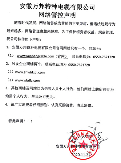鄭重聲明:安徽萬邦特種電纜有限公司官方網站為:www_wanbangcable_com.buerdi.com.cn,除此之外無任何子網站或合作網站,其余均為假冒偽劣。電話:0550-7621728 13485756353 地 址:安徽省天長市滁州高新技術產業開發區經四路29號